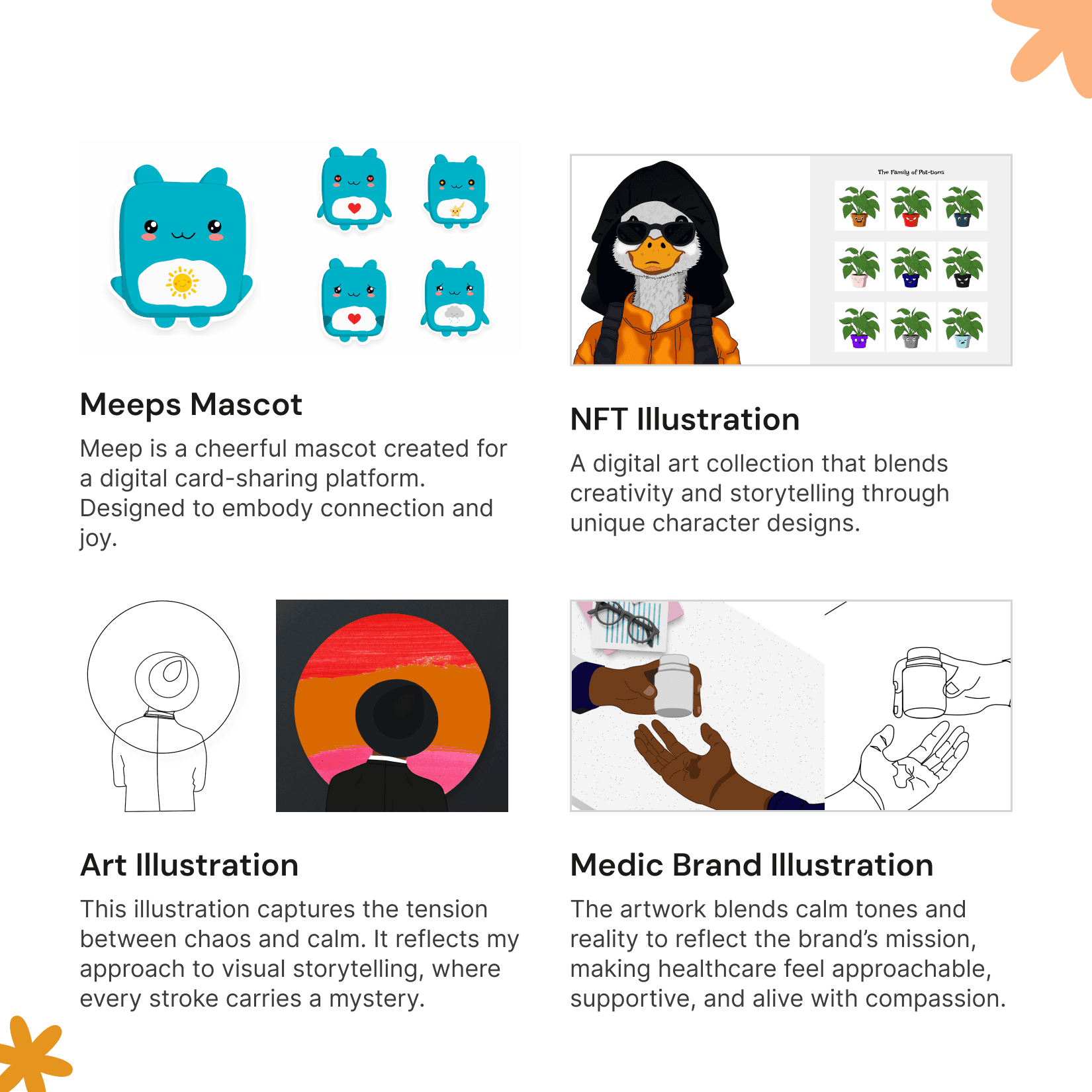A collection of self-initiated illustration explorations focused on visual storytelling, composition, and expressive experimentation to support digital product and brand communication.